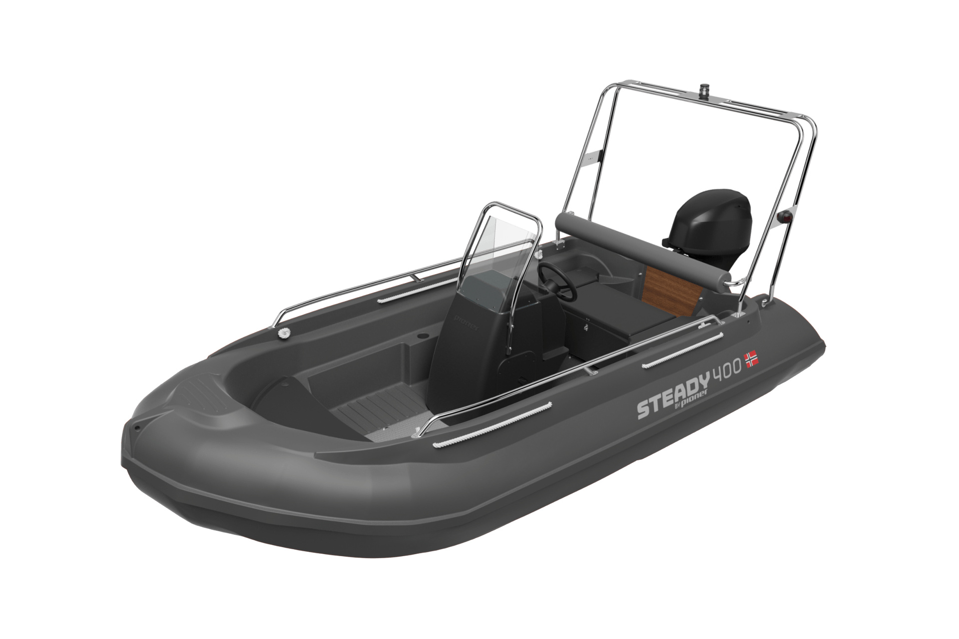 400 Steady By Pioner lze snadno upgradovat na odolný skif s volitelnými doplňky, jako jsou nerezové kolejnice, konzole s prostorem pro baterii, čelní sklo, rám čelního skla, polstrovaná zádová opěra.
