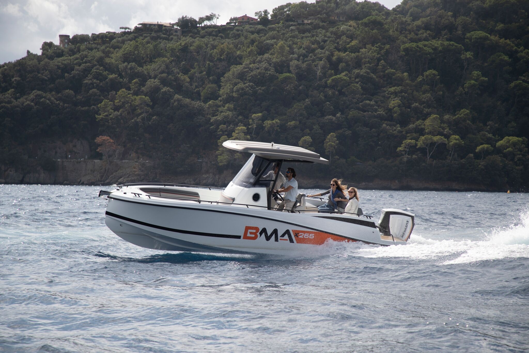 Ve standardní výbavě motorového člunu BMA X266 Open naleznete nerezové kování, pumpu, kompas, konzoli, příďovou schránku, čalounění, sprchu, navigační světla, kabinová okna, záďovou sedačku, sedadla, automatickou bilge pumpu, žebřík, nádrž na vodu 75 L, palivová nádrž 350 L, bateriový odpojovač, úložné prostory, hydraulické řízení, klakson, sprchu a umyvadlo uvnitř konzole, volant.